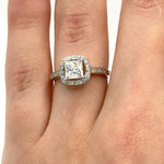 Moissanite engagement ring with a luminous square design, featuring a radiant square-cut center stone set in a sleek metal band for a modern and elegant look.